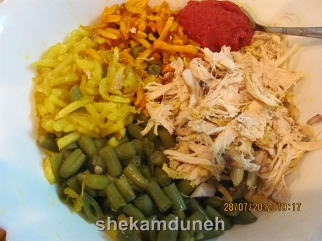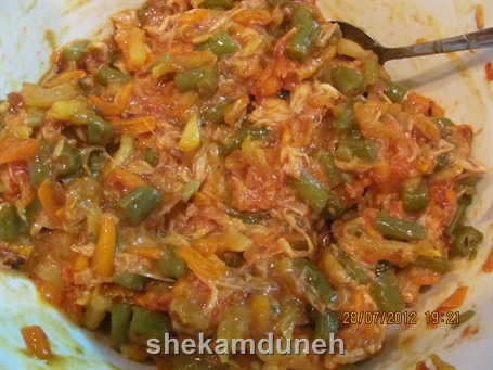 لوبیا سبز خرد شده و پخته ( ۱ فنجون ) ** سینه مرغ پخته و خرد شده ( ۱ فنجون ) **