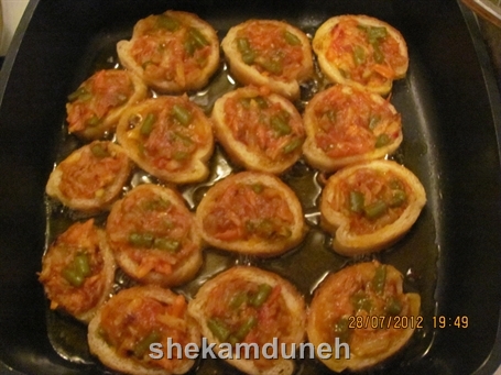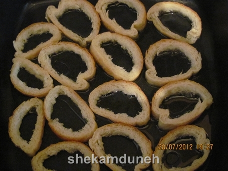 روغن در ماهیتابه میریزیم و حلقه های نان باگت را کف تابه میچینیم.