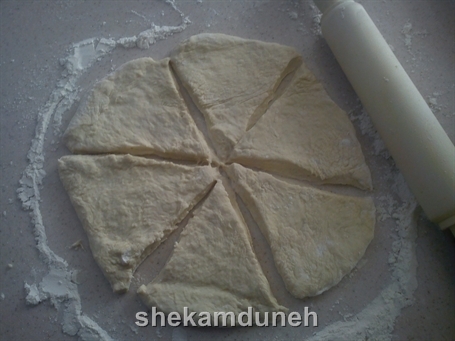 کف تخته آرد میپاشیم و خمیر رو به کمک وردنه به شکل دایره باز میکنیم و دایره رو ۶قسمت میکنیم.
