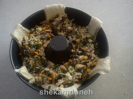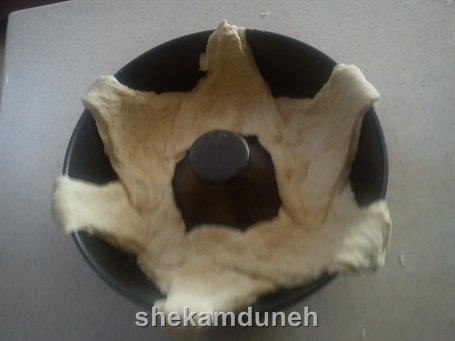 قالبمونو چرب میکنیم و خمیر رو تو قالب طوری میچینیم که نوک مثلثی آن به بیرون باشه مثل عکس