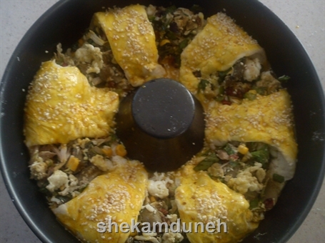 لبه های خمیر رو روی مواد قرار میدیم و روی اونو با مواد زیر رنگی میکنیم..... ( ۱ عدد زرده تخم مرغ + ۱قاشق غذاخوری شیر+ ۱قاشق چایخوری زعفران دمکرده + مقداری کنجد )