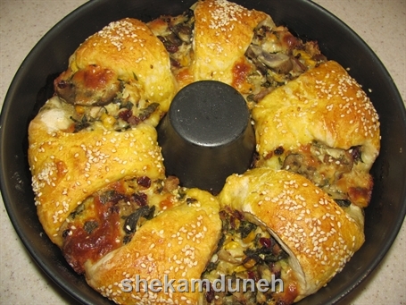 یه چی میگم بین خودمون بمونه و به کسی نگین ( من از خمیر حاضری نون باگت استفاده کردم که زیاد جالب نبود ولی شما از خمیر پیتزا استفاده کنین ) و نکته ای که باید بهش دقت کنین اینه که خمیر باید نازک پهن بشه تقریبا" به ضخامت ۴ یا ۵ میلیمتر! موادی رو که از قبل آماده کرده بودیم روی خمیر داخل قالب میریزیم.......