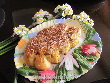 اگه حوصله ی این مدل خمیر رو نداشتین میتونین ساده مواد رو لای خمیر بریزیم و به شکل بیضی لو له ش کنیم و با قیچی آشپزخونه چند برش به دور اون بزنیم و مثل قبلی روشو با مواد طلایی کنیم و تو فر بپزیم.......