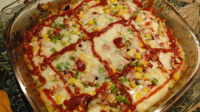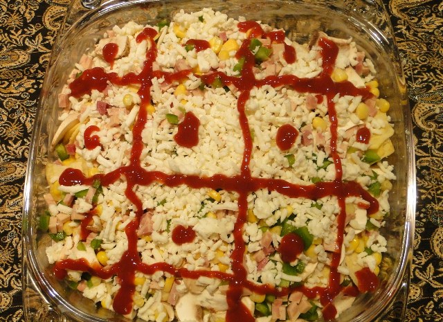 بعد چیبس ها رو می چینیم کف ظرف بعد یه نمه پنیر میپاشیم روش(دقت کنید یه نمه!نه یه خروار!) بعد روش قارچ ها رو میچینیم و بعد کمی کالباس و ذرت و فلفل بعد اگه دوست داشتین باز یه قاشق سس روش پخش میکنین اگه مامانتون (یا افراد دیگه مثل همسرتون! بچتون! هرکیتون!) از سس خوشش نمیاد نمیریزین!بعد یه خروار پنیر رنده شده روش پخش میکنین(دقت کنین یه خروار! نه یه نمه!) بعد دوباره (اگه دوست داشتین همچین قطور و پر ملات بشه!) این کار رو تکرار میکنین. نهایتا یه نمه پنیر روش پخش میکنین و سس قرمز اضافه میکنین و ظرف و میزارین در داخل فر با درجه ی دلخواه!